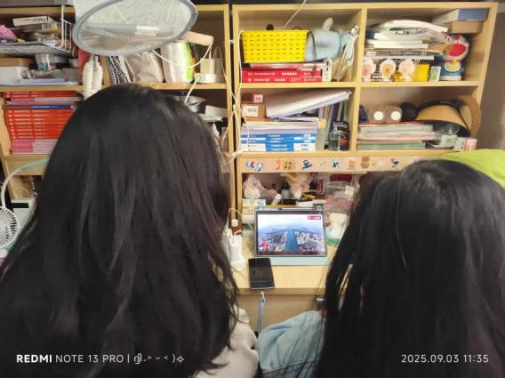本次活动除集体集中观看外,部分班级还采用自主观看模式。同学们在宿舍围坐一堂,边看阅兵边分享感悟,在轻松且专注的氛围中,共同感受祖国的繁荣昌盛与强大实力,每个人的心中都充满自豪与骄傲。