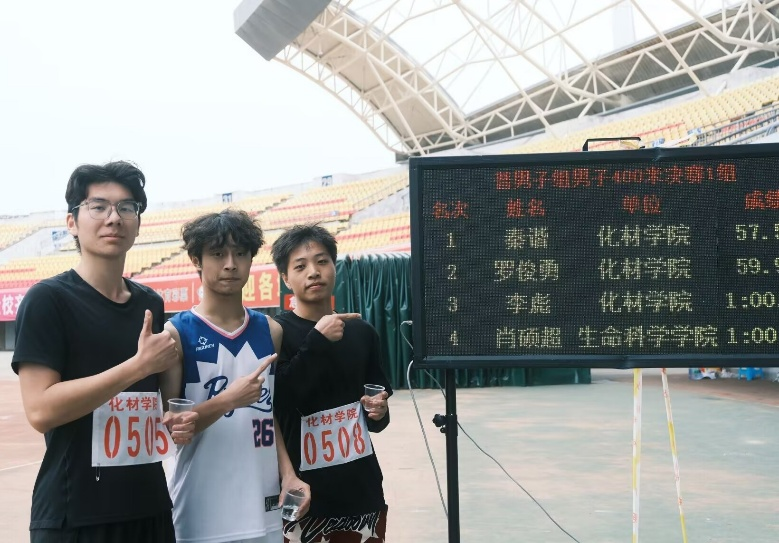 本届运动会,我院健儿奋勇拼搏,战果辉煌。化材人不仅在团体赛中获女子4×100米第三名、男子4×100米第一名;在个人单项中,谢宁获普通组女子400米第三名、宋豪获普通组男子800米第二名、吴依欣获普通组女子800米第一名、方一枝获普通组女子跳远第一名。不仅如此,在今年的普通组400米决赛中,秦谐、罗俊勇和李彪轻松拿下了金银铜三枚奖牌。这些沉甸甸的奖牌,既是运动员们汗水与付出的最好见证,更是集体荣誉的璀璨结晶。在此,向所有获奖同学表示热烈祝贺,你们的卓越表现为化材增添了新的荣光!