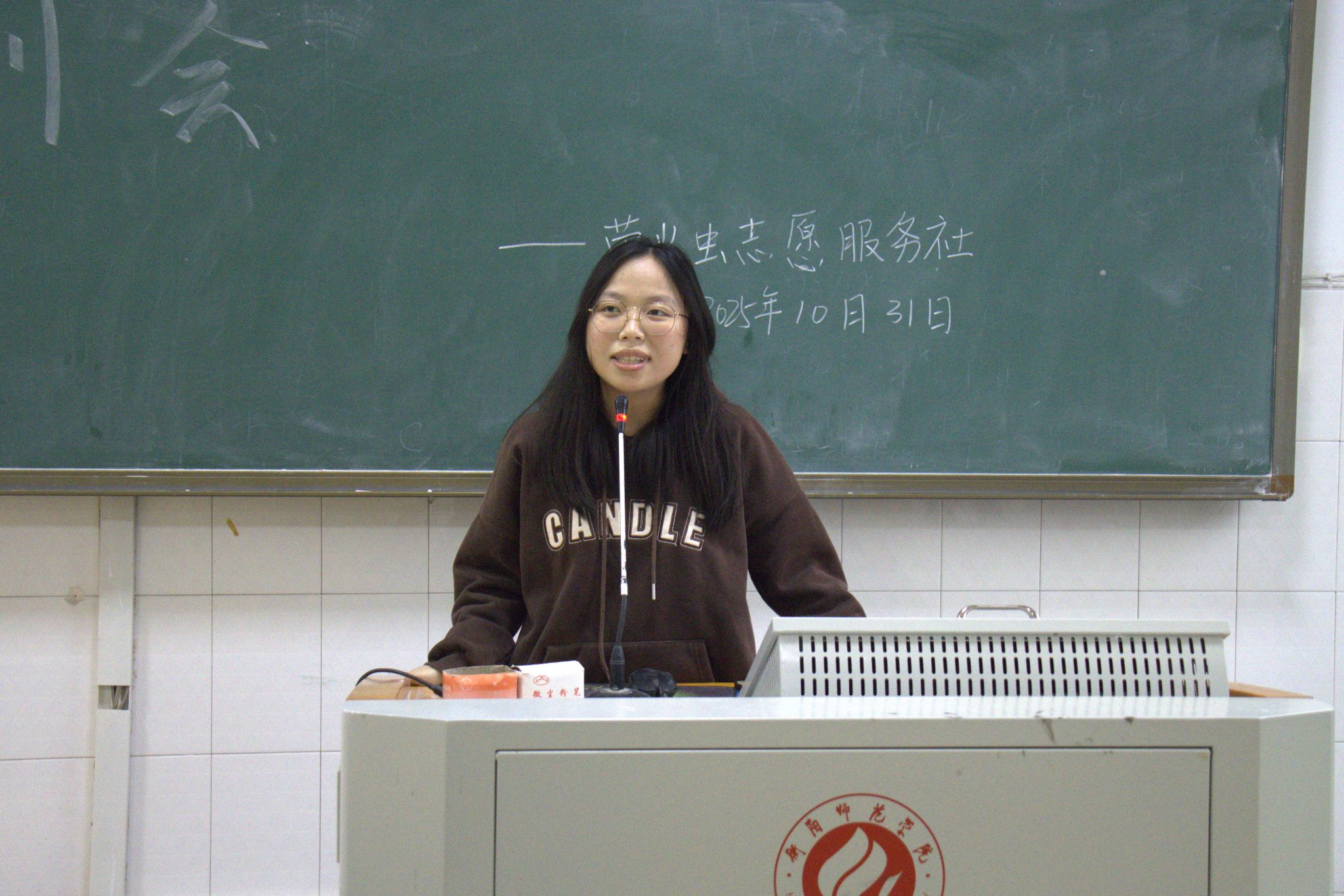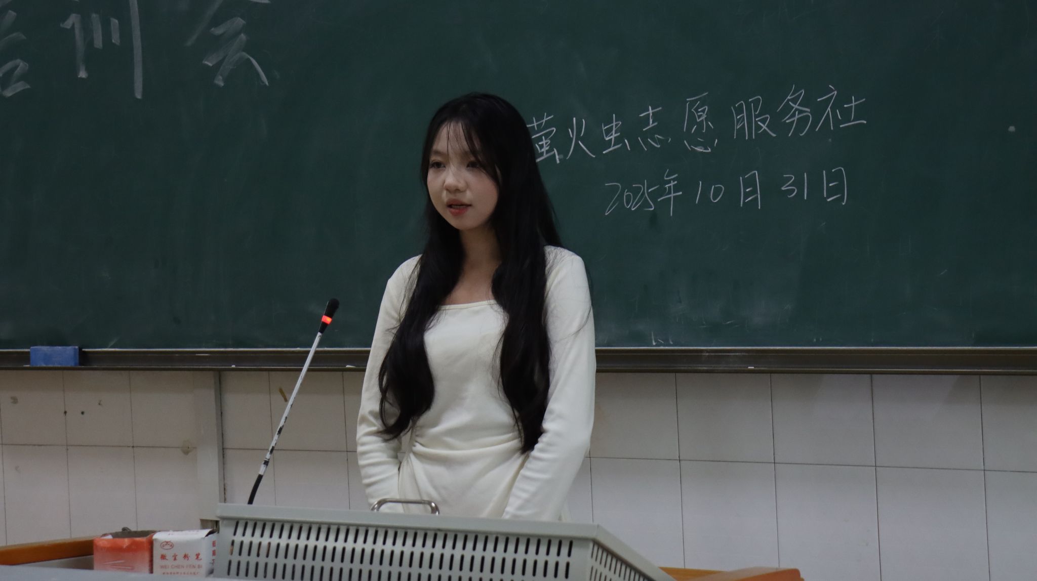 在主讲人深入讲解之后,萤火虫志愿服务社社长周彬彬与社会实践部部长龙宇萍相继登台发言。部长龙宇萍满脸热忱,首先对所有新进志愿者的加入表示热烈欢迎,用真挚的话语让新人感受到社团的温暖氛围。随后,社长周彬彬结合社团过往的志愿服务经历,分享了志愿服务中 “传递温暖、助力他人”的核心理念,鼓励新进志愿者们将奉献精神融入日常服务,在实践中践行志愿初心,为社团的志愿服务事业注入新活力,现场氛围在社长的带动下愈发热烈。